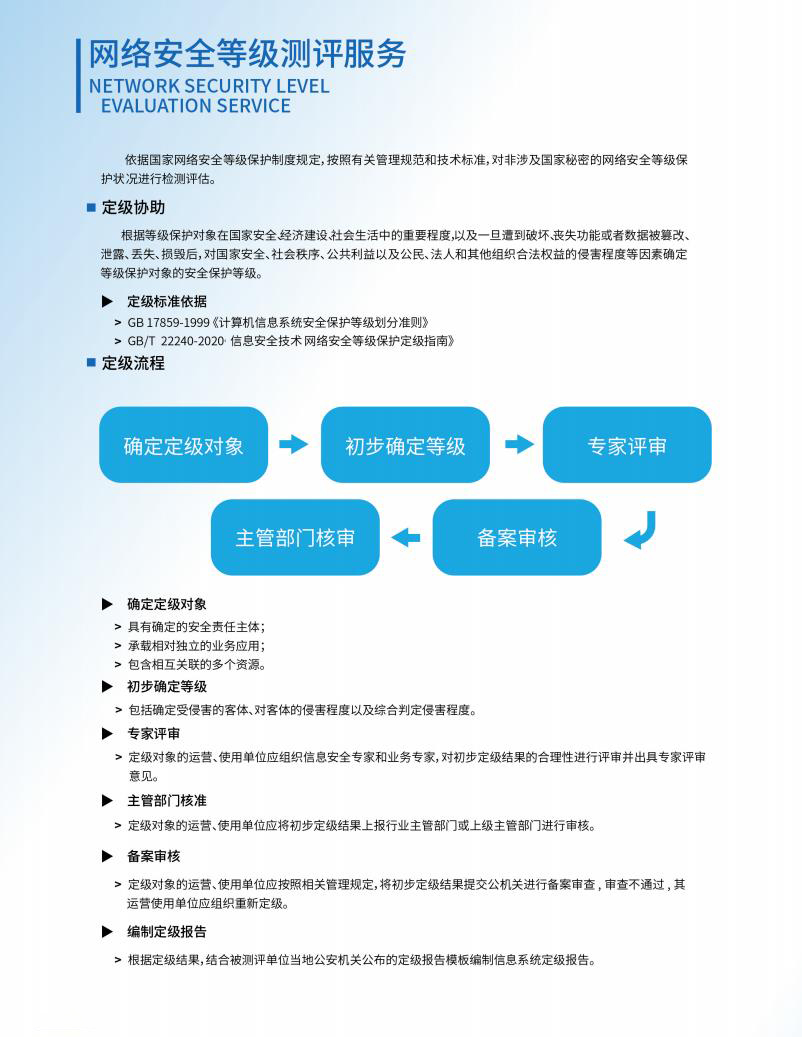 依据国家等级保护定级指导政策、标准、各行业制定的定级指导意见为被测评单位提供定级协助。【四川中成基业安全技术有限公司】